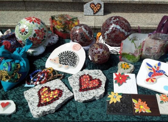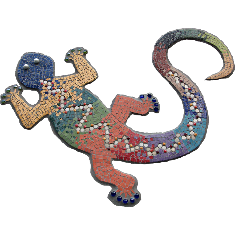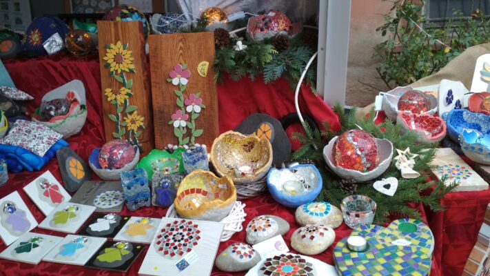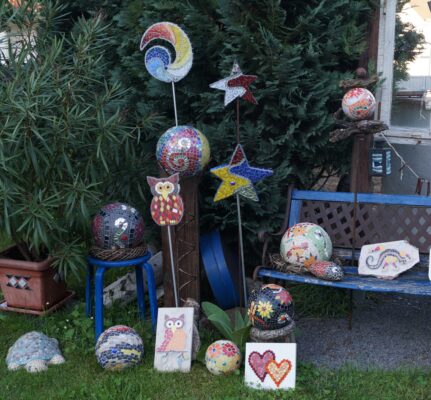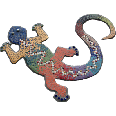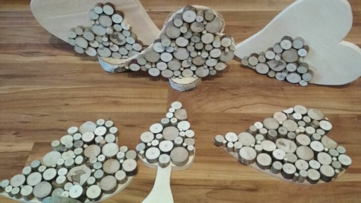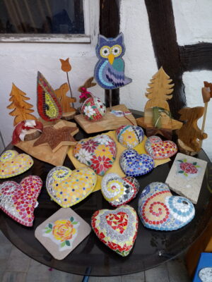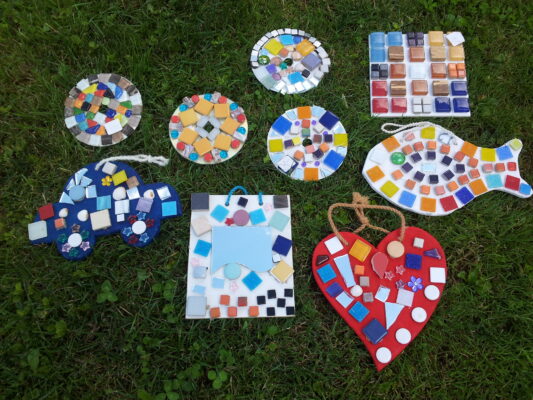 Die Kinder dürfen Figuren aus Holz mit bunten Mosaik-Steinen bekleben. Dazu können Holz, Muscheln und Steine oder buntes Glas und Fliesen verwendet werden.