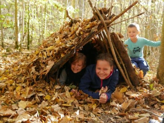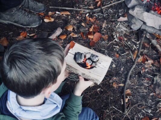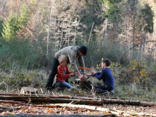 • Die Kinder mit nichtmotorisierten Werkzeugen Holz bearbeiten (Taschenmesser, Säge, Axt)